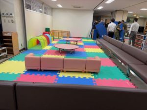 07:00に命令下達され、まず業務隊によって託児所施設を開設。ソファーを移動し、柱や机の角にクッション材をほどこし、厚生センターの一角がたちまち子どもたちの空間に変身します。