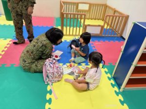 その後、各部隊からの支援要員を受けて夕方まで臨時の託児所が運営されます。今回は実際に子どもたちが参加して、受付の段階から大変リアルな訓練となりました。