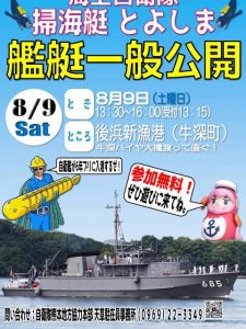8月9日(土)13:30~16:00の間、熊本県天草市牛深町の後浜新漁港において海上自衛隊掃海艇「とよしま」の一般公開が行われました。限られた時間でしたが、507名ものお客様が集まり、大変な活況でした。