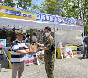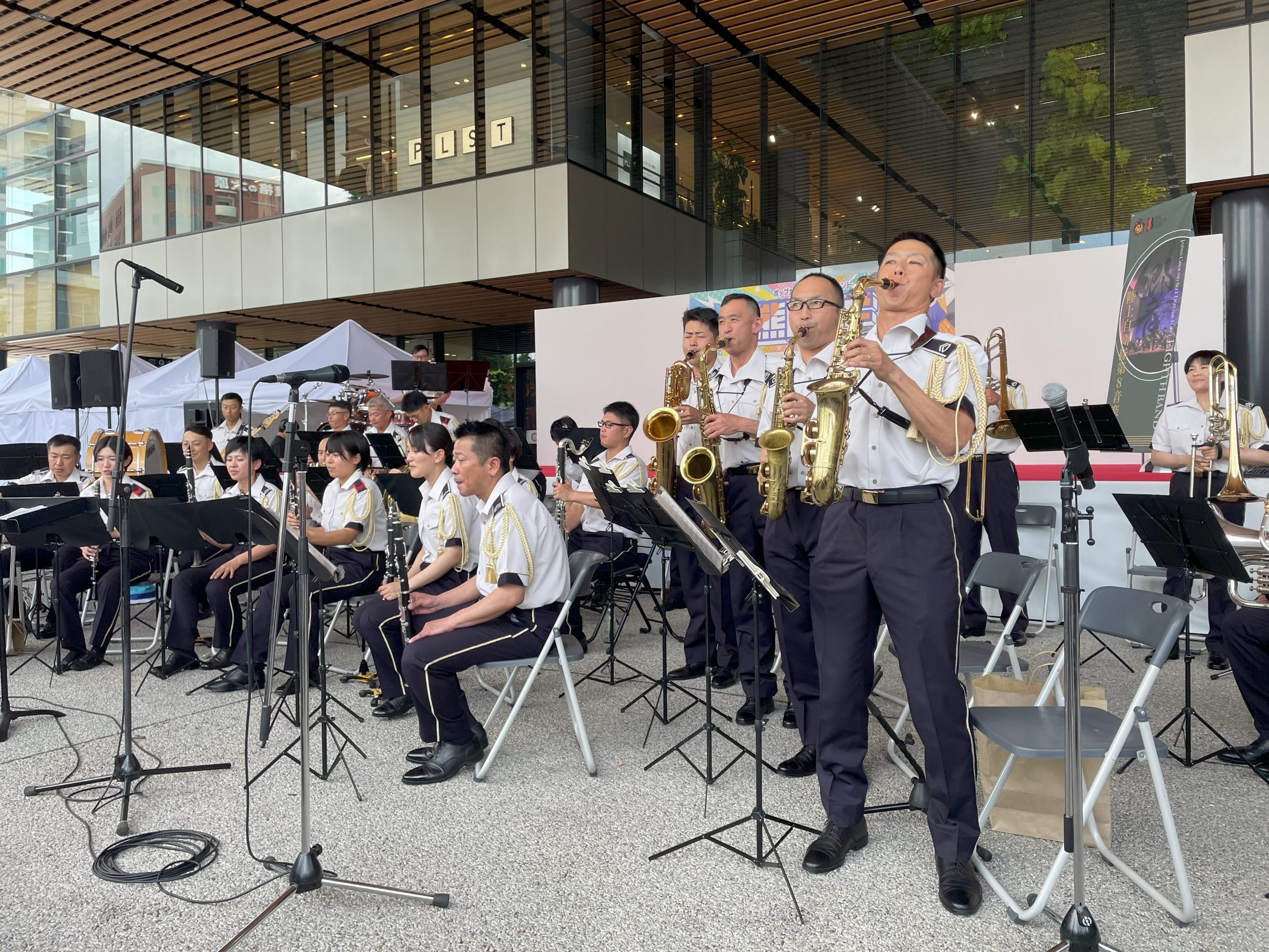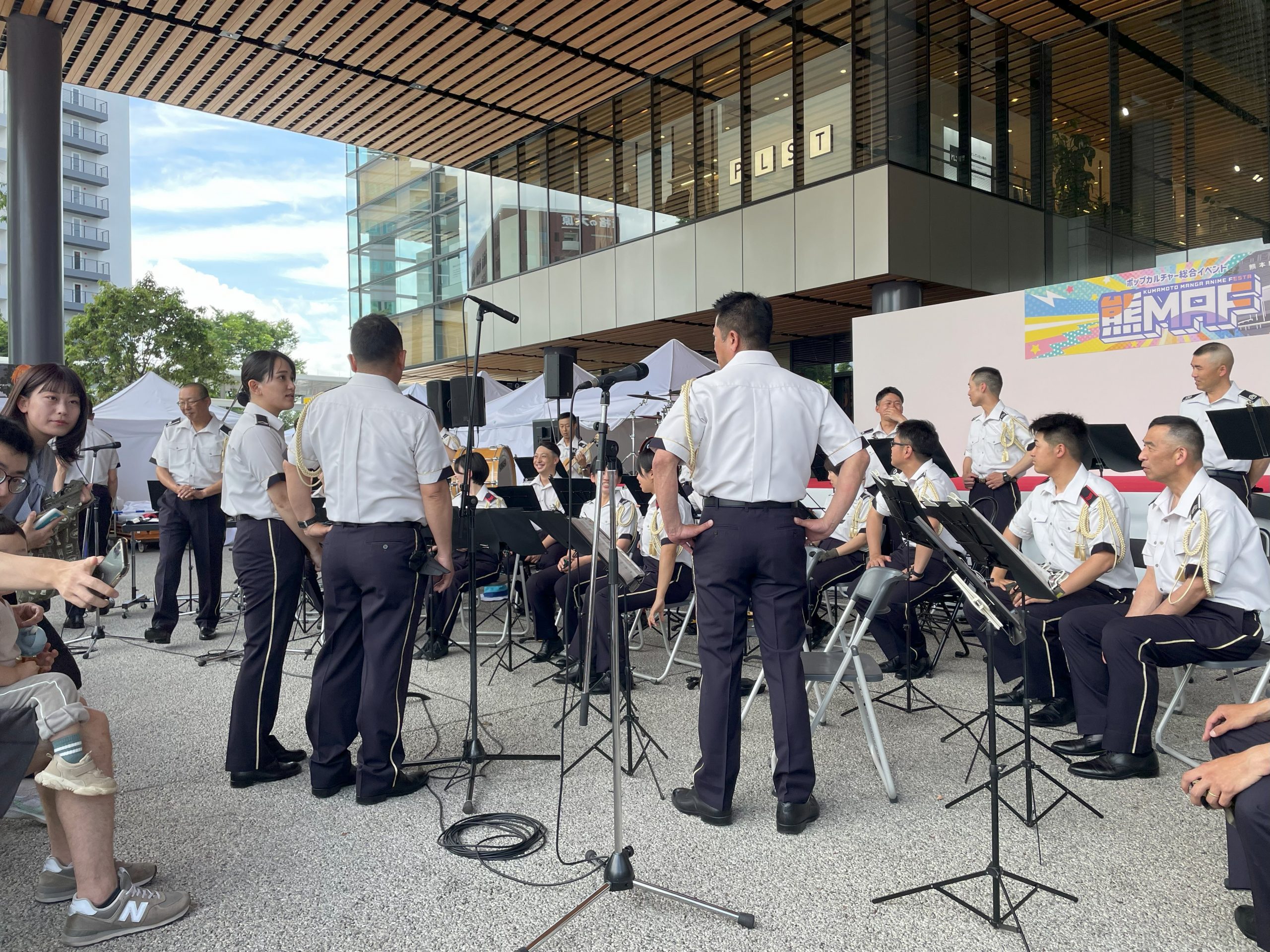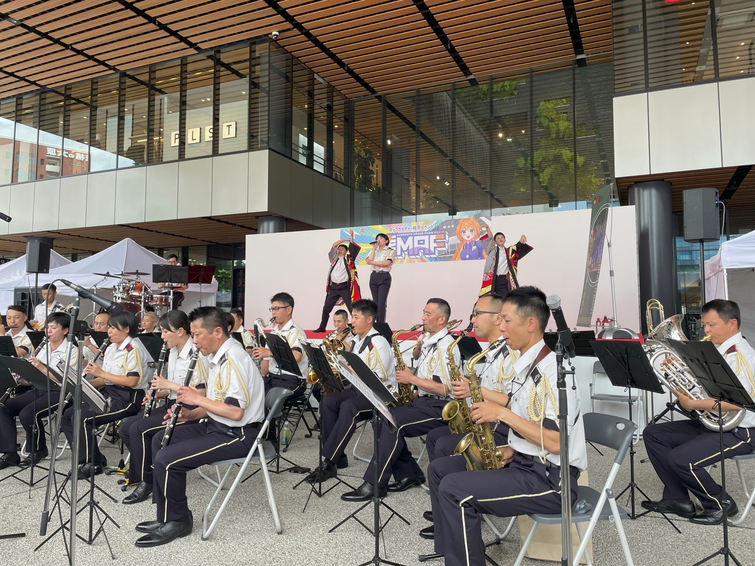 今日の目玉は第8音楽隊のコンサート。アニメソングだけで構成した40分ほどのプログラムでしたが、どれも聴き応え十分で、たちまち会場は溢れんばかりの人垣になりました。驚いたのは演奏だけでなく歌、ダンスのレベルの高さ。何事も全力で取り組む8音スピリッツを感じました。(熊本県会長:光永)