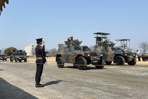 また標兵を見ると小銃を「立て銃(床尾板を地面おいて銃口付近を保持する持ち方)」ではなく腰で抱えるようにして持っています。これは最新の20式小銃が短くコンパクトになっているためです。装備が変わると基本動作も変わる好例でしょう。その他、思いつくまま書きます。